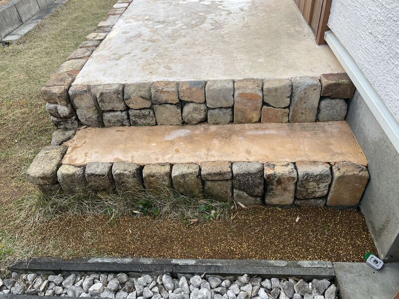 玄関ポーチの0段目?の部分は床面に基礎のコンクリートが敷いてあるので土が薄く、芝が上手く生育しないんじゃないかと言われていました。