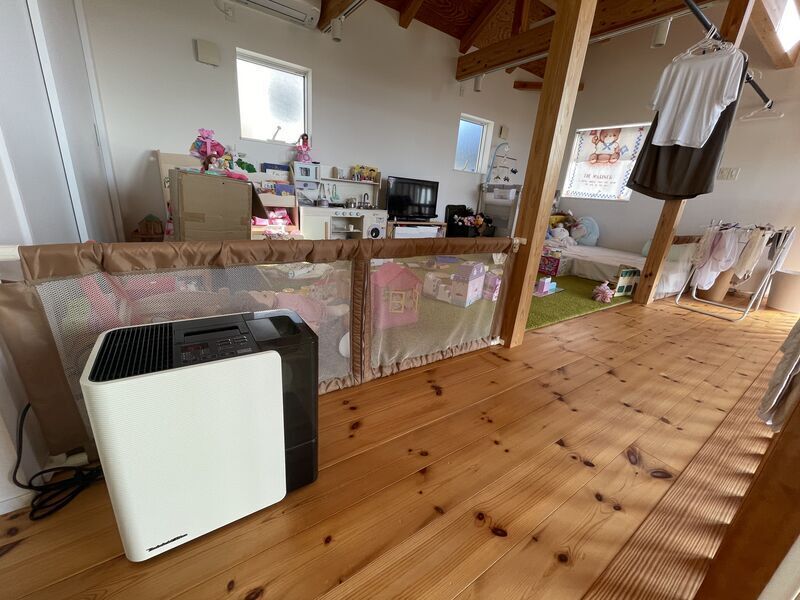 この加湿器がめちゃくちゃパワフルで、吹き抜けを介して1階と2階の両方をしっかり加湿してくれます💪